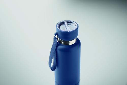 Double wall insulated bottle in 90% recycled stainless steel and 10% stainless steel, with integrated strap handle and additional long strap (70cm) in PP lid. Leak-free. Bottom cup included. Capacity: 500 ml.