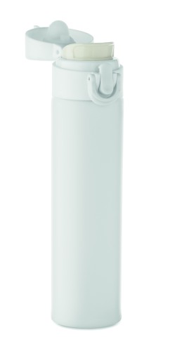 Double wall drinking bottle in recycled stainless steel (90% recycled stainless steel and 10% stainless steel) with security lock on the lid and press-to-open option. Leak free. Capacity: 300ml.