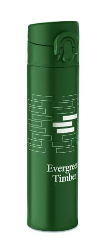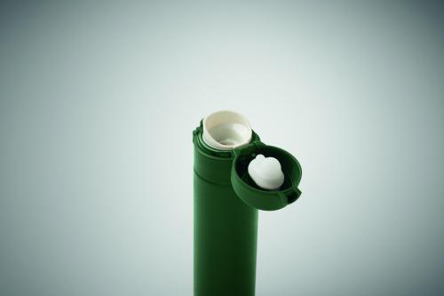 Double wall drinking bottle in recycled stainless steel (90% recycled stainless steel and 10% stainless steel) with security lock on the lid and press-to-open option. Leak free. Capacity: 300ml.