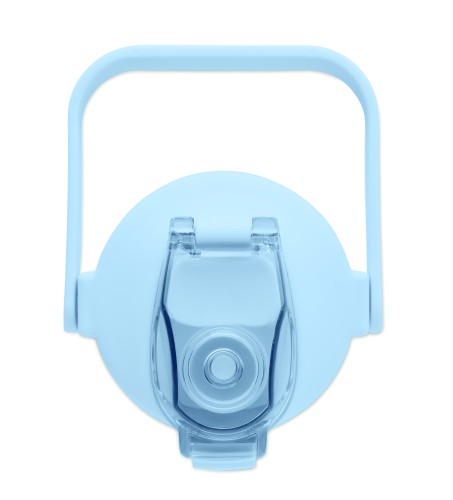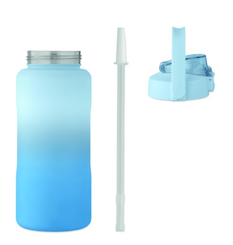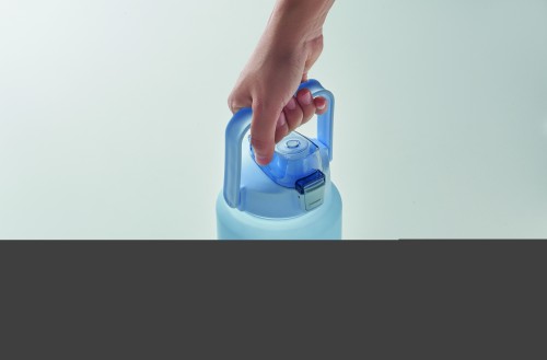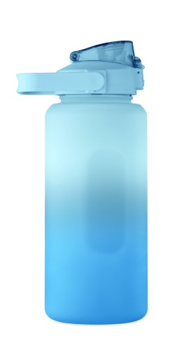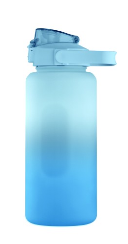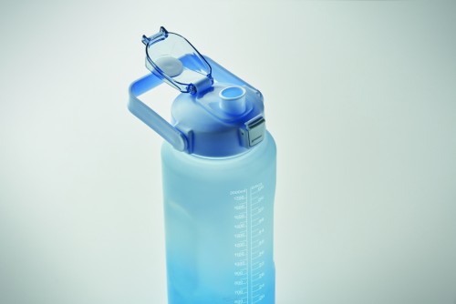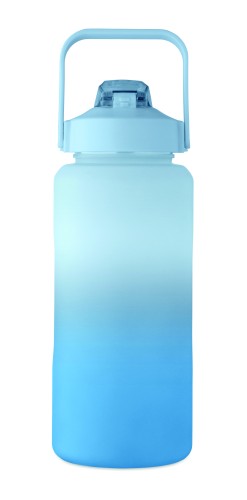 Motivational water bottle in RPET. Features a one-hand open flip-top lid with straw, safety lock, and handle. Leak-free. Capacity : 2000 ml