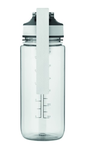 Motivational sports water bottle in RPET with integrated straw, soft silicone mouth piece, one hand opening flip top lid, safety lock. With carrying strap in RPET satin. Capacity 700 ml. Leak free.