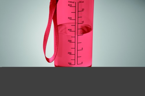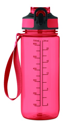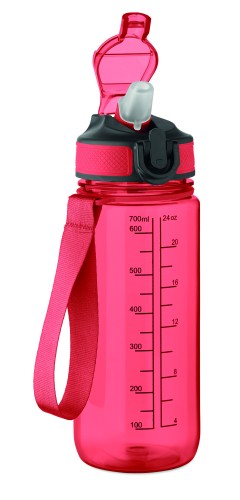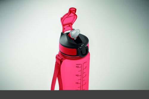 Motivational sports water bottle in RPET with integrated straw, soft silicone mouth piece, one hand opening flip top lid, safety lock. With carrying strap in RPET satin. Capacity 700 ml. Leak free.