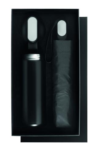 "2-piece gift set with 600 ml double wall recycled stainless steel bottle with PP lid, metal detail, and silicone handle, plus 21"" foldable windproof pongee umbrella with ABS handle in gift box."