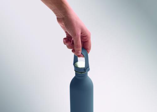 Single wall bottle made of 90 % recycled stainless steel and 10% stainless steel with rubber finish. Includes PP and SS lid with silicone handle. Capacity: 500 ml.