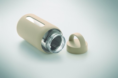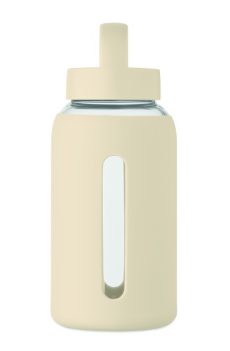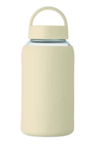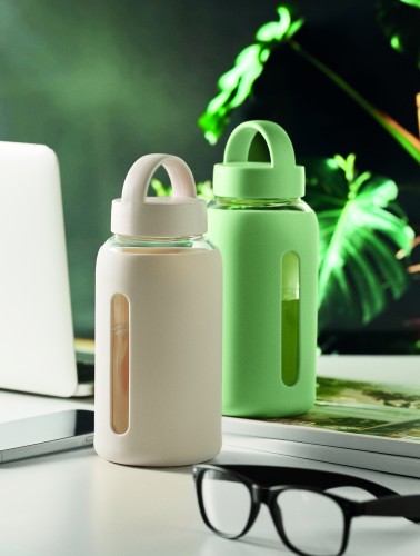 High borosilicate glass bottle with silicone pouch and PP lid with handle. Capacity: 600 ml