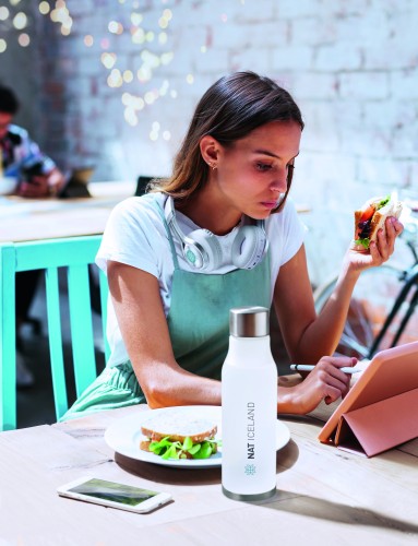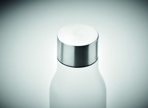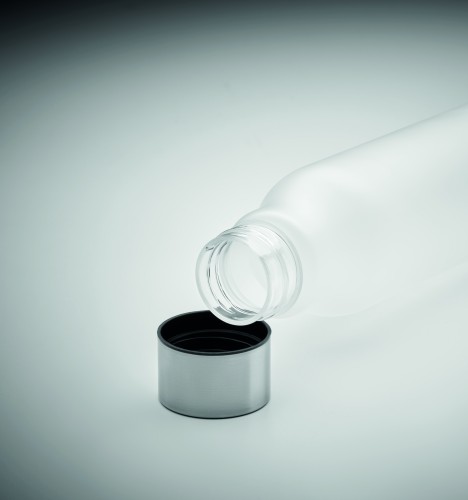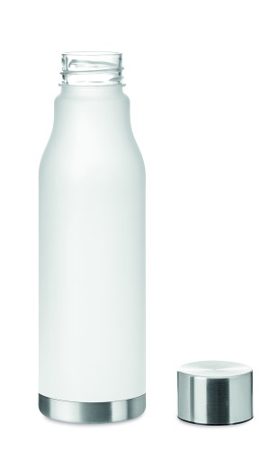 Drinking bottle in RPET with rubberised finish (frosted transparent) and stainless steel cap with inner RPET lid and silicone ring. BPA free. Leak-free. Capacity: 600 ml. Not suitable for carbonated drinks.