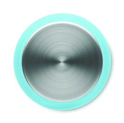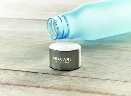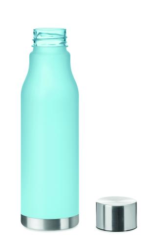 Drinking bottle in RPET with rubberised finish (frosted transparent) and stainless steel cap with inner RPET lid and silicone ring. BPA free. Leak-free. Capacity: 600 ml. Not suitable for carbonated drinks.
