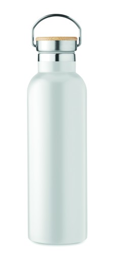 Double wall Stainless Steel insulating vacuum flask with bamboo lid and carry handle. Capacity: 750 ml. Leak free. Bamboo is a natural product, there may be slight variations in colour and size per item, which can affect the final decoration outcome.