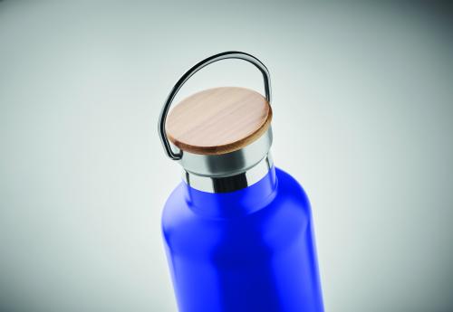 Double wall Stainless Steel insulating vacuum flask with bamboo lid and carry handle. Capacity: 1L. Bamboo is a natural product, there may be slight variations in colour and size per item, which can affect the final decoration outcome.
