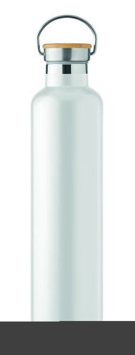 Double wall Stainless Steel insulating vacuum flask with bamboo lid and carry handle. Capacity: 1L. Bamboo is a natural product, there may be slight variations in colour and size per item, which can affect the final decoration outcome.