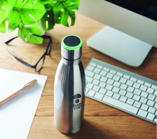 Double wall stainless steel bottle with hydration reminder. Sensor light glows every hour reminding you when it is time to drink. Including 1 CR2032 battery. Capacity: 500 ml.