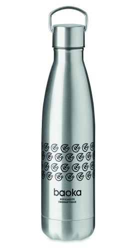 Double wall stainless steel insulating vacuum bottle with handle lid. Capacity 500 ml. Leak free.