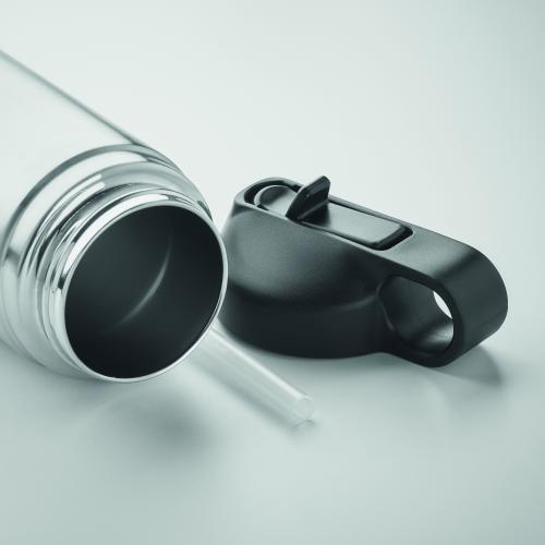Double wall recycled stainless steel (90% recycled stainless and 10% stainless steel) insulated vacuum bottle with grip handle lid in PP and integrated straw built-in straw cap. Leak-free. Capacity: 500 ml.
