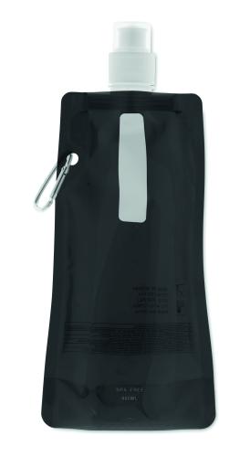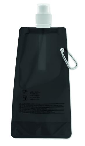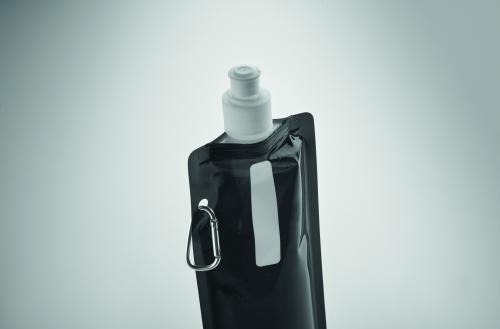Foldable water bottle in PET which is BPA free with aluminium carabiner. Capacity 480 ml. Leak free.