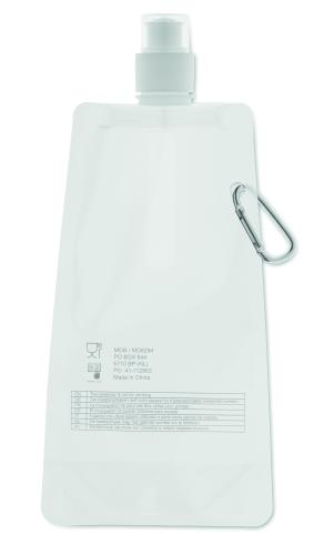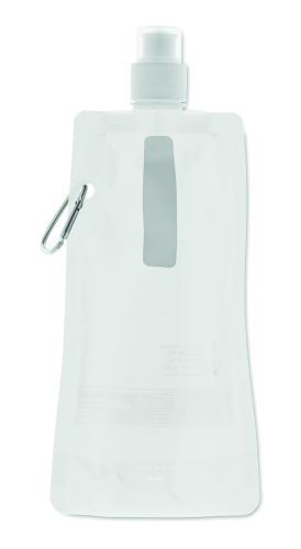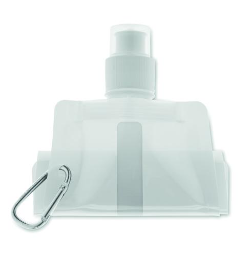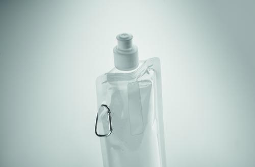 Foldable water bottle in PET which is BPA free with aluminium carabiner. Capacity 480 ml. Leak free.