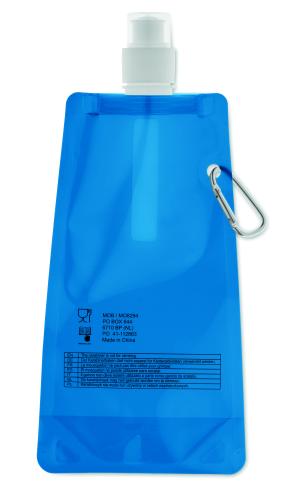 Foldable water bottle in PET which is BPA free with aluminium carabiner. Capacity 480 ml. Leak free.