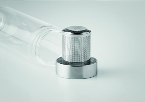 Single wall in high borosilicate glass bottle with tea infuser and neoprene pouch. Capacity 500 ml. Not suitable for carbonated drinks. Leak free. Laser engraving is not possible on borosilicate glass.
