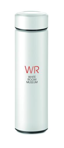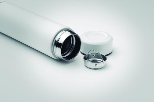 Double wall stainless steel insulating vacuum flask with additional tea infuser. Capacity 425 ml. Leak free.
